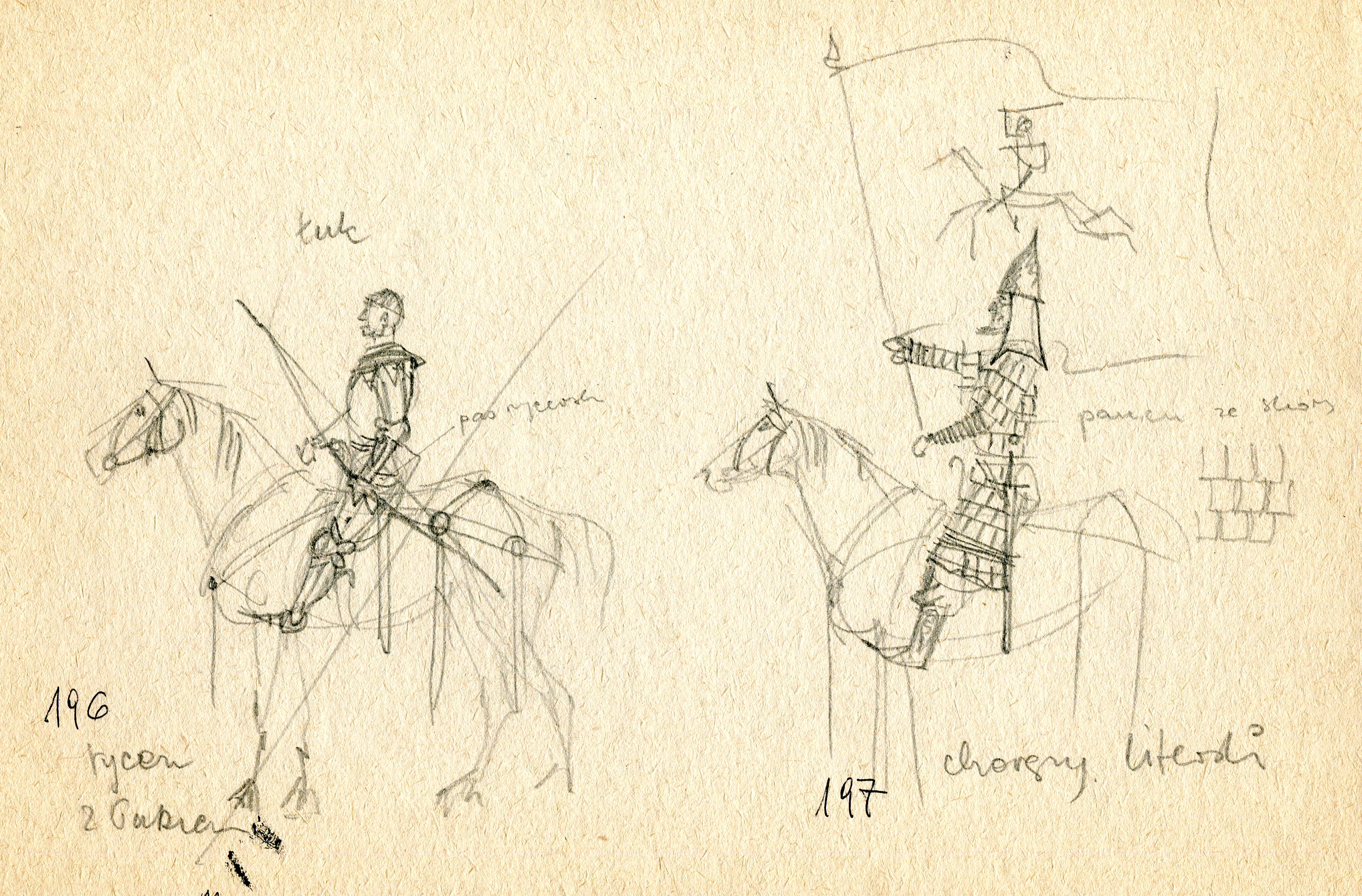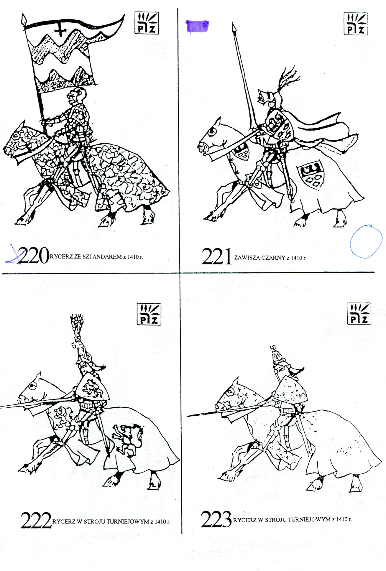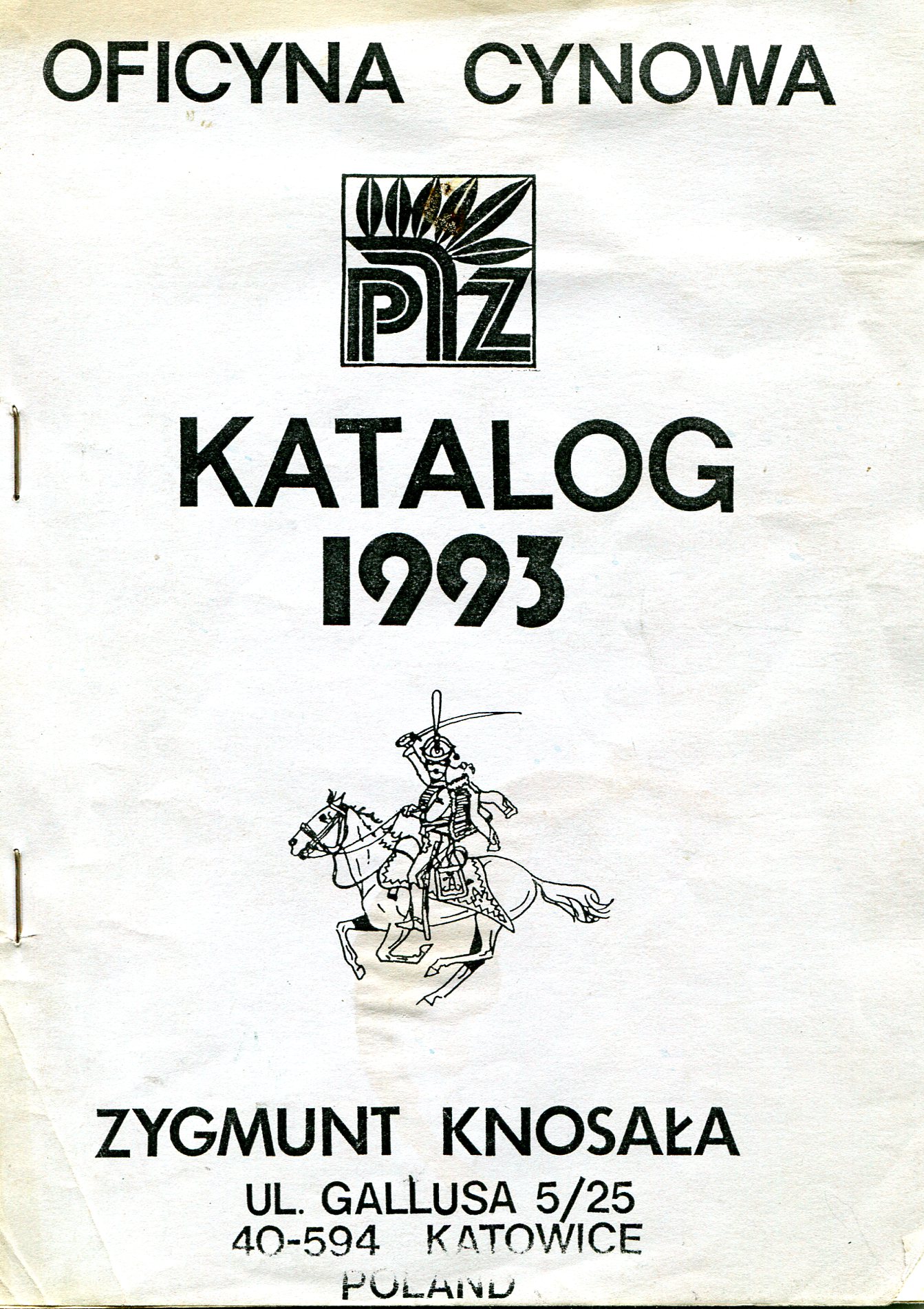 Oficyna Cynowa „PZ” legitymowała się bardzo bogatą ofertą figurkową. W tym znaczną jej część stanowiły figury konne to jest komplety składające się z jeźdźca i konia. Konny jest zawsze niezaprzeczalną atrakcją dla kolekcjonerów i znawców figury historycznej. Pamiętam też scenę rodzajową z karczmy, gdzie bodaj jacyś napoleońscy żołnierze wdają się w pojedynek, który ma miejsce w jakiejś przypadkowej gospodzie. Nie wiem dlaczego ta scena przywodzi mi film Ridley’a Scott’a „Pojedynek” z 1977 roku. Wiem,że otoczenie, główni adwersarze – wszystko to czyni klimat, buduje atmosferę. Scenka była przedstawiona w ujęciu dynamicznym i układała się w swoistą dioramę. Dioramy stawały się wówczas modne. Oficyna Cynowa „PZ” była w tej dziedzinie jedną z pierwszych. Ofertę otwierały wyobrażenia figur zbrojnych z X wieku, a zamykały ją przedstawienia z początku XX stulecia. Mnie szczególnie obchodziła wcale bogata kolekcja rycerstwa i zbrojnych z czasu Grunwaldu. Byli też rycerze zakonni. Miłośnicy XVII wiecznej wojskowości mogli delektować się pancernymi, husarią i tureckimi przeciwnikami. Piotr Górkiewicz wykonał tym samym tytaniczną pracę i to nie tylko w materii tworzenia samej rzeźby. Ona była namacalnym finałem – bo figurą – procesu przygotowawczego prowadzącego do poznania realiów czasu przedstawienia kreacji figury historycznej jej kształtu i formy z zachowaniem detali właściwych danej epoce. Wszystko co zostało stworzone w Oficynie ujmowano w katalogach. W tekście i galerii przedstawiono okładki i detale z katalogów tematycznych jakie przygotowano dla odbiorców. Twórcą tych katalogów był mój przyjaciel Andrzej Klein. W tekście i galerii pomieszczono jego projekty w rozmaitych stadiach ich powstawania. To jest dokument nie do przecenienia. Niewielu jest gitarzystów wirtuozów, których można poznać po wysłuchaniu pierwszych dźwięków wydobytych z ich instrumentów. Tak się rzecz ma w przypadku Andrzeja Kleina. On nie mógłby rysować dla podziemnej prasy w okresie okupacji. Jego kreskę natychmiast byłby rozpoznał pierwszy konfident, nie wspominając o niemieckich analitykach i znawcach sztuki. Wiem, że się powtarzam, ale to naprawdę mowa o istotnych cechach składających się na niepowtarzalność Oficyny Cynowej „PZ”.