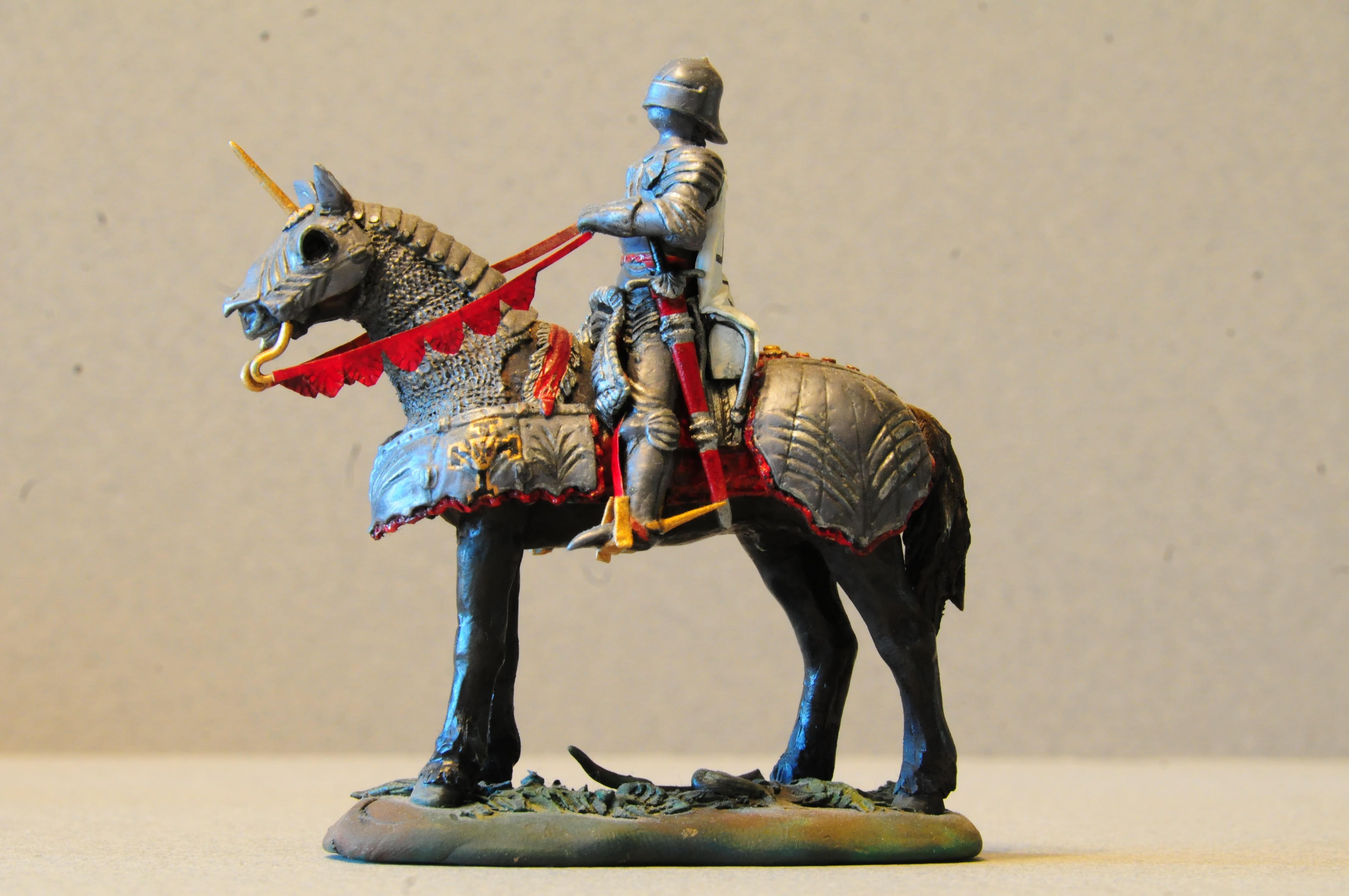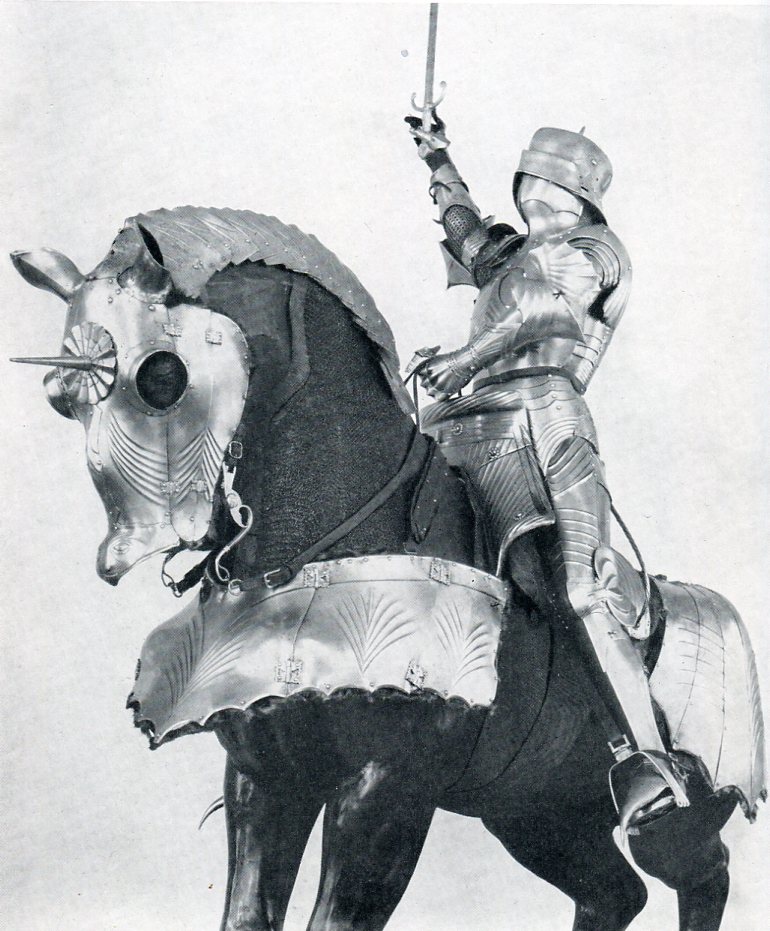 Zobrazowany wyżej zestaw ilustracji pokazuje ten sam garnitur uzbrojenia ochronnego pochodzenia niemieckiego z ostatniej ćwierci XV wieku utrwalony poprzez zdjęcie obiektu, obraz pędzla Leszka Rościszewskiego i figurę historyczną. Proszę się przyjrzeć uwidocznionym na nich detalom i zastanowić się nad bogactwem rozwiązań konstrukcyjnych i artystycznych. Koniec XV wieku stał się w dziedzinie produkcji uzbrojenia ochronnego podstawą do eksplozji form, zdobnictwa zbroi w XVI wieku, o ironio w okresie kiedy tak naprawdę rozwój broni palnej i nowych taktyk stosowanych na polu walki eliminował powoli z użycia tę formę ochron ciała jako już anachroniczną. Nic jednak nie następowało gwałtownie a siła oddziaływania psychologicznego zbrojnego w blachy męża była stale obecna w świadomości współczesnych.