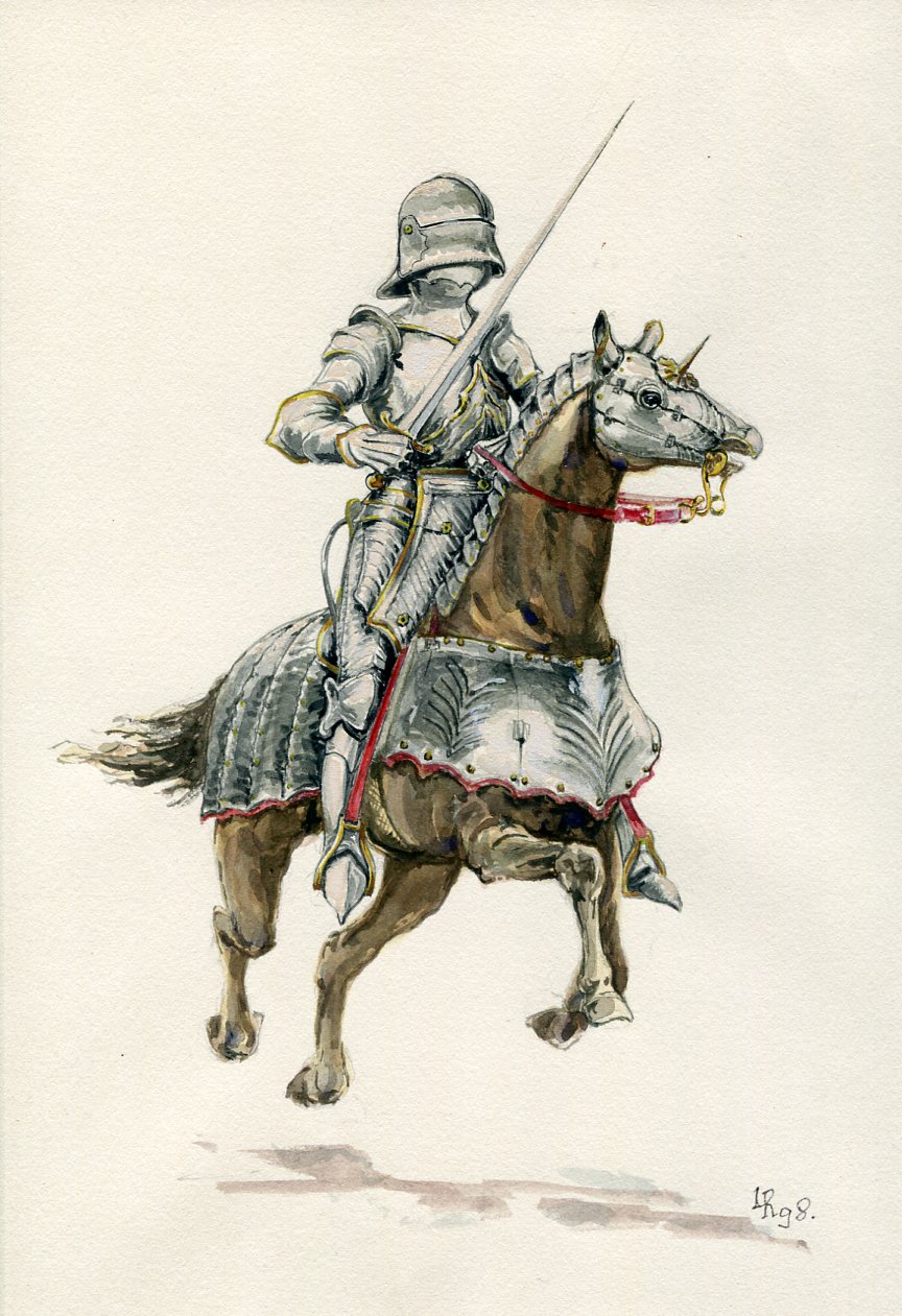Zakon Krzyżacki istniał jako sąsiad naszego państwa do 1525 roku. My ukształtowani wizjami artystycznymi przedstawiającymi wygląd Krzyżaków w sposób nieco jednostronny i ograniczony czasowo do okresu Grunwaldu no i może jeszcze Płowiec nie możemy zapominać, że w czasie trwania ich władztwa zmieniał się wygląd i uzbrojenie rycerzy mnichów. Ostatnie wypowiedzi pani dr Małgorzaty Grupa zawarte w jednym z artykułów prasowych budzą kontrowersje i każą się mieć na baczności. Część dotycząca Krzyżaków wymaga w kontekście rekonstrukcji pochówków krzyżackich w Kwidzynie naprawdę rozwagi i spokojnego podejścia a przede wszystkim głębokiej analizy Średniowiecza w optyce kostiumu i barwy w szerokim rozumieniu ówczesnego widzenia świata i bogatej symboliki wszechobecnej w ówczesnym życiu. Ostatnia ćwierć XV wieku przynosi piękne i dojrzałe rozwiązania w dziedzinie uzbrojenia ochronnego. Przedstawiam kilka wyobrażeń znakomitego garnituru uzbrojenia dla jeźdźca i konia. Nie mamy wprawdzie bezpośrednich świadectw wskazujących jednoznacznie na to iż takie właśnie zbroje nosili najznaczniejsi Krzyżacy. Z dużym jednak prawdopodobieństwem możemy sądzić iż tego typu garnitury były w użyciu. Do takiego sądu uprawniają następujące czynniki. Pochodzenie uzbrojenia: południe Niemiec. Skład narodowościowy Krzyżaków i płynące stąd związki z kulturą i rzemiosłem obszaru niemieckojęzycznego. Moda na nowe rozwiązania techniczne w dziedzinie uzbrojenia. Tu wśród ludzi parających się wojną obowiązuje od wieków zasada, że nie tylko ma być pięknie, na czasie, ale i użytkowo. Konieczność uzupełniania uzbrojenia powodowana jego zużyciem nie tylko w bezpośredniej walce ale i wskutek naturalnego procesu starzenia się materiału z którego je wytworzono. Wreszcie też aktualne wymogi pola walki. Przedstawiam więc ilustracje prezentujące uzbrojenie i rycerzy zakonnych w zbrojach, których nie okrywa tkanina i pysznią się one fakturą metalu oraz utrwaloną w nim estetyką dojrzałego gotyku zarówno w formie jak i detalach zdobienia.