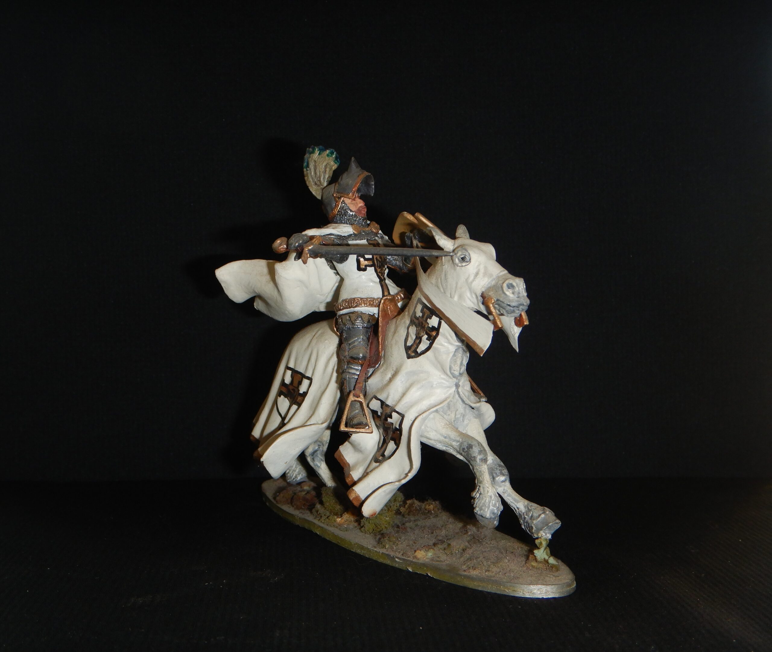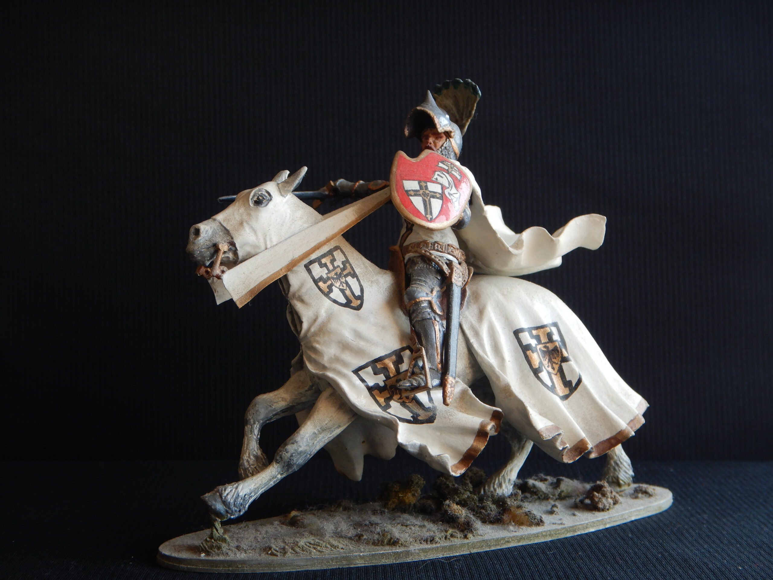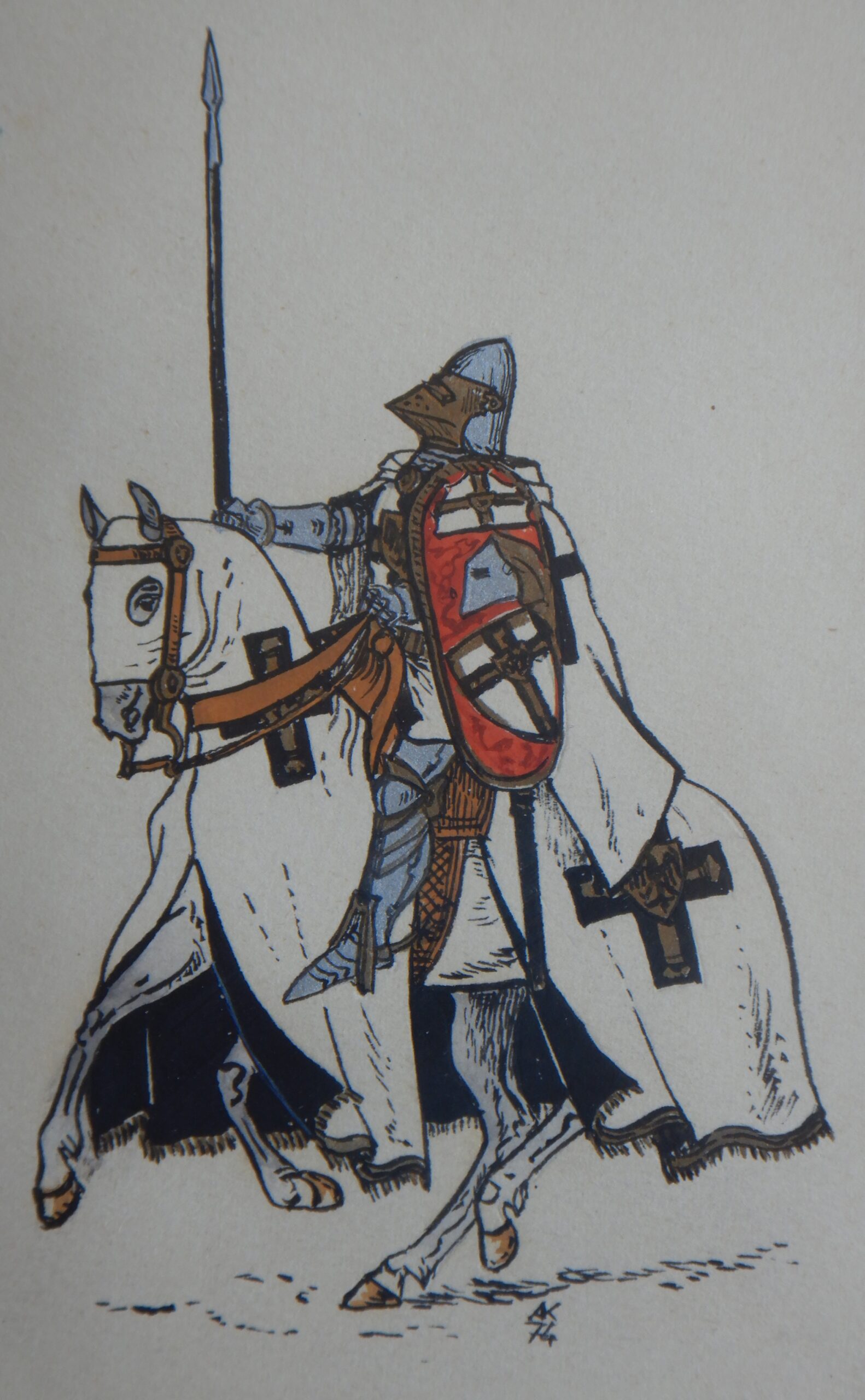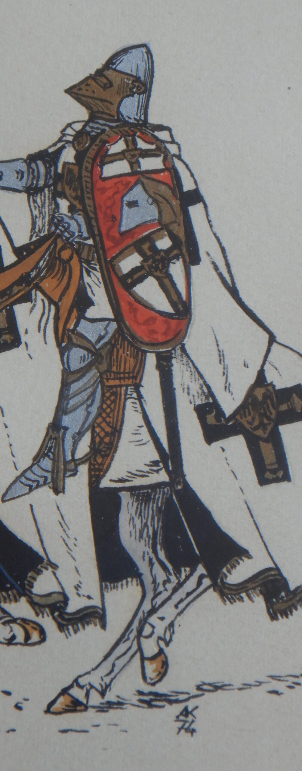 Od 5 lipca 2024 roku do 1 października 2024 roku, a być może do końca tego roku Muzeum Zamkowe Malborku prezentuje publiczności i prezentować będzie wystawę: „Krzyżak jak malowany”. Nie byłem jeszcze w tym roku w Malborku, więc jej nie widziałem. Jednego jestem pewien. Tego obiektu, który teraz przedstawię, nie ma na przedmiotowej ekspozycji. Gdyby się tam znalazł, byłby bez wątpienia jedną z jej ozdób. Zatem jako miłośnik zapoznany tematyki krzyżackiej pokazuję przedstawienie Krzyżaka na pewno mało znane. Czynię to w cyklu: „ANDRZEJ KLEIN MAŁO ZNANY”. Będzie to teraz odsłona 7. Gdybym bawił się w numerologię, siódemka miałaby podwójne znaczenie w moim przypadku. Tym, którzy po raz pierwszy w cyklu, spieszę z informacją: Andrzej Klein był mi przyjacielem w broni i barwie. Pamięć o nim i jego spuściźnie plastycznej, a przede wszystkim o CZŁOWIEKU nakłada na mnie obowiązek zapisywania -być może nieudolnie – oraz upowszechniania świadectw jego dorobku artystycznego, który -moim zdaniem- wskutek splotu rozlicznych zawirowań dziejowych (których nie szczędzi nam historia) nie zajął należnej mu pozycji. Odsłona 7 prezentuje coś – nawet jak dla mnie – niezwykłego. Jest to obraz przedstawiający wielkiego mistrza na koniu w galopie(?). Powstał on: 2024 – 1974 = 50 ca pół wieku temu. W 1974 roku mistrz Andrzej Klein posługiwał się inną kreską w swoich pracach. Była ona drobniejsza, cieńsza i gęstsza. Nie akcentowała mocno konturu. Miała w sobie coś z rysunku rekonstrukcyjnego. Uzupełniał ją umiejętnie stosowany – acz oszczędnie – kolor. Kolor, który tak cenią znawcy barwy, szczególnie ci od miłośników broni i barwy. Późniejszą technikę – tak dla własnego użytku – nazwałem flamastrową. Charakteryzowała się wyrazistymi liniami. Wzbogacała tylko stosowane przez niego środki wyrazu. Wzmacniała przekaz treści zawartej na karcie papieru. W tematyce bronioznawczej niosła komunikat nie pozostawiający żadnych niedomówień. Nie było i nie ma więc, w tym niczego pejoratywnego. Wypracowanie własnego stylu, rozpoznawalnego na pierwszy rzut oka to nieczęsty dar. Od pierwszego dźwięku instrumentu rozpoznaję gitarzystów obdarzonych tym przymiotem, mimo iż sam nie mogę poszczycić się dobrym słuchem muzycznym. Jeśli mnie pamięć nie myli, to nasze Państwo Podziemne w ramach akcji N skierowanej do Niemców celem obniżenia ich morale, zatrudniało wielu rysowników, którzy ostrzem ciętej graficznej satyry godzili we wroga. Nie wszystkich jednak chętnych do tej niezwykłej pracy konspiracyjnej, brano pod uwagę. A to ze względu na stosowany przez nich niepowtarzalny i rozpoznawalny styl rysunku. On to eliminował między innymi twórczość Jerzego Zaruby. Problemy miała też Maja Berezowska z racji subtelnej kreski, autorskiego znaku firmowego. Ale to inna historia. W kreacji Andrzeja Kleina, wielki mistrz zakonu krzyżackiego niesie na lewym ramieniu tarczę ceremonialną – jak myślę – Karola z Trewiru. Dlaczego ceremonialną? Spodziewałbym się bardziej, że wielki mistrz przedstawiony w uzbrojeniu XV – wiecznym i w kropierzu ze znakami wielkiego mistrza Zakonu Szpitala Najświętszej Marii Panny Domu Niemieckiego w Jerozolimie, powinien raczej nieść tarczę na której w czteropolowym podziale winny sąsiadować herb wielkiego mistrza zakonu i herb własny wielkiego mistrza w układzie szachownicowym. Uradowany darem, nie zapytałem autora, skąd wziął się pomysł takiego, a nie innego przedstawienia wielkiego mistrza w tej właśnie kreacji. Wiem z jego relacji, że wiele spraw z dziedziny broni i barwy konsultował z Andrzejem Nadolskim. Panowie znali się, należeli do Stowarzyszenia Miłośników Dawnej Broni i Barwy i niejednokrotnie współpracowali ze sobą. Rysunek tarczy wielkiego mistrza Karola z Trewiru w wykonaniu Andrzeja Kleina pojawił się również w publikacjach książkowych autorstwa Andrzeja Nowakowskiego ilustrowanych przez Andrzeja Kleina. Są to: „Uzbrojenie wojsk krzyżackich w Prusach w XIV w. i na początku XV w.” Łódź 1980 i jej angielskojęzyczna wersja: „Arms and armour in the medieval Teutonic Order’s State in Prussia” Łódź 1994. Wracając do obrazu wielkiego mistrza zakonu krzyżackiego autorstwa Andrzeja Kleina, nie sposób nie zauważyć jak wielki wpływ miała twórczość tego miłośnika broni i barwy na innych członków naszego Stowarzyszenia. Swego czasu pisałem na naszej Stronie o Piotrze Górkiewiczu i jego Oficynie Cynowej „PZ”. Zainteresowanych odsyłam do tekstu: https://www.bronibarwa.org.pl/10379-2/. Tych mniej zachłannych na tę wiedzę, informuję, że Piotr Górkiewicz tworzył projektowane przez siebie figury historyczne prezentujące mężów zbrojnych w szerokim spektrum czasowym. Były wśród przedstawienia husarzy, pancernych, żołnierzy z czasów napoleońskich i rycerstwa spod Grunwaldu, by wymienić tylko niektóre. Wyroby oficyny „PZ” są rozsiane po całym świecie i wszędzie jawią się jako ozdoby kolekcji. Z racji moich zainteresowań Krzyżakami i uzbrojeniem ochronnym szczególną uwagę skupiałem na figurkach historycznych kreujących zbrojnych z tego okresu. Wielki mistrz uwieczniony na obrazie -bohaterze- niniejszego pisania mógł być nieobcy Piotrowi Górkiewiczowi, który znał dobrze Andrzeja Kleina. Kreacja Krzyżaka z 1974 roku musiała zapaść w pamięć założyciela Oficyny Cynowej „PZ”. Inauguracja jej działalności nastąpiła kilka lat później. Świadectwem tego jest prezentowana figura konna wielkiego mistrza w dynamicznym ujęciu. Skojarzenie z obrazem miał też Leszek Rościszewski (tym nabytkiem na pewno mu się pochwaliłem), który cynową kreację Krzyżaka autorstwa Piotra Górkiewicza, pomalował w swoim stylu, w mistrzowski sposób.