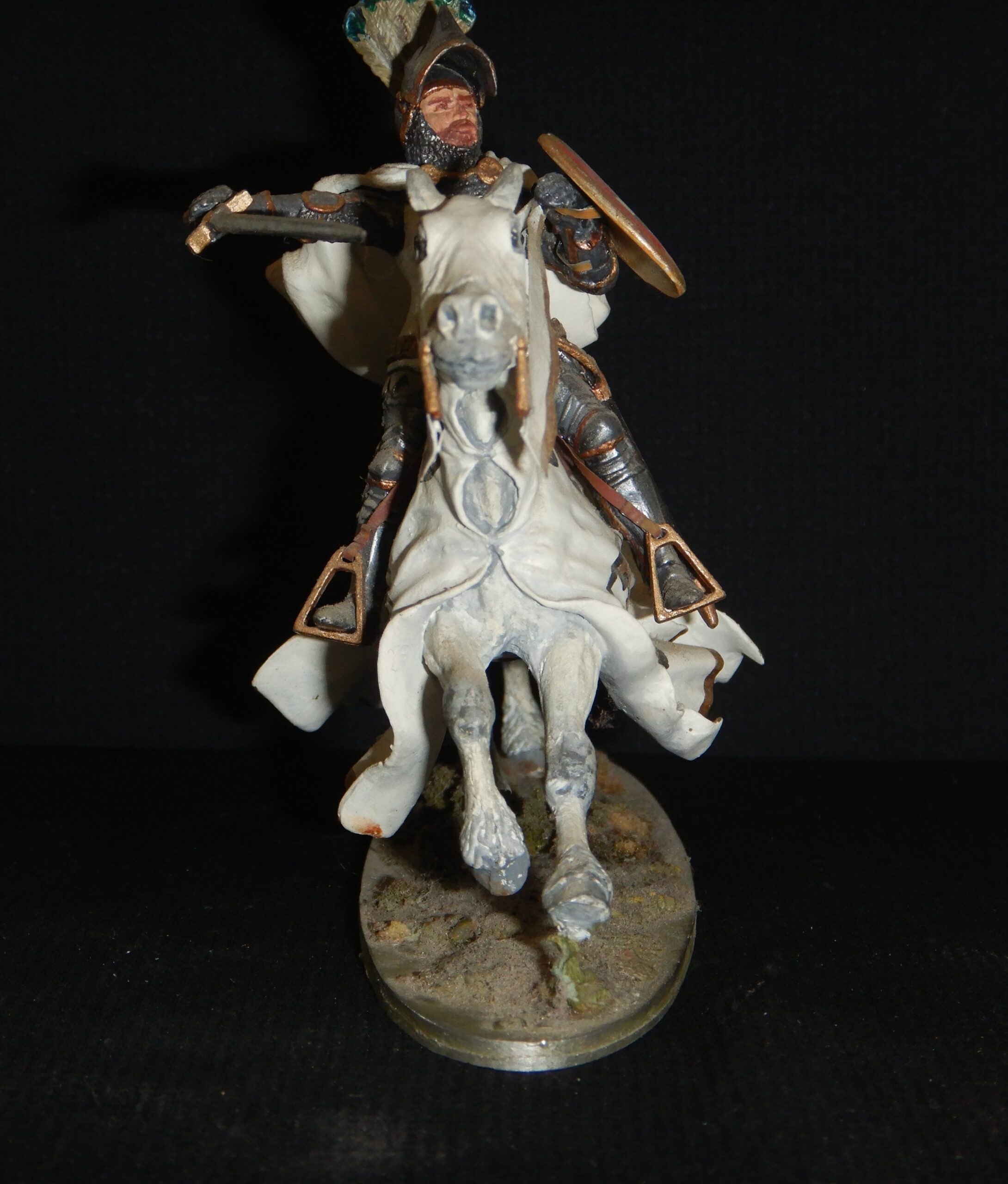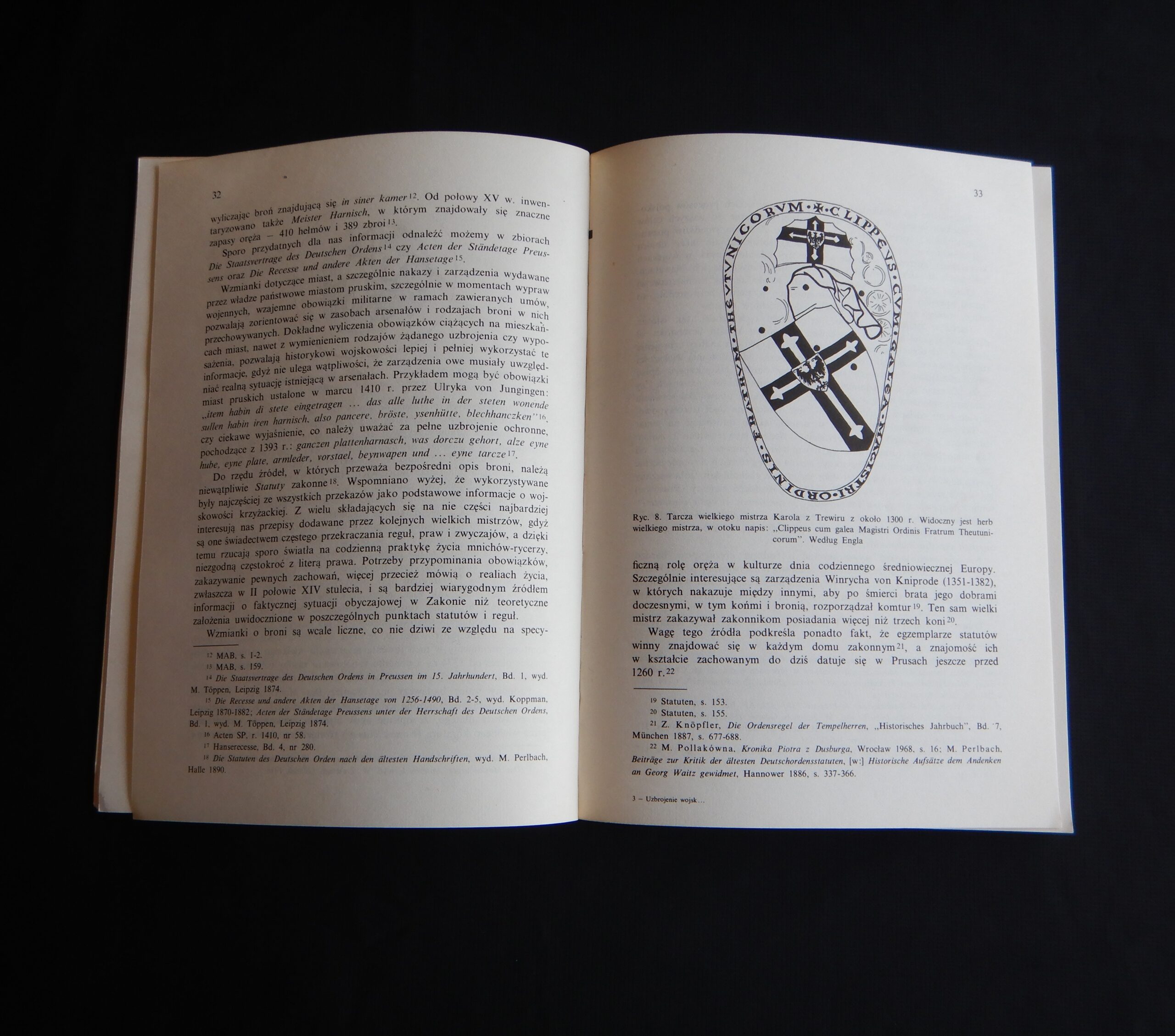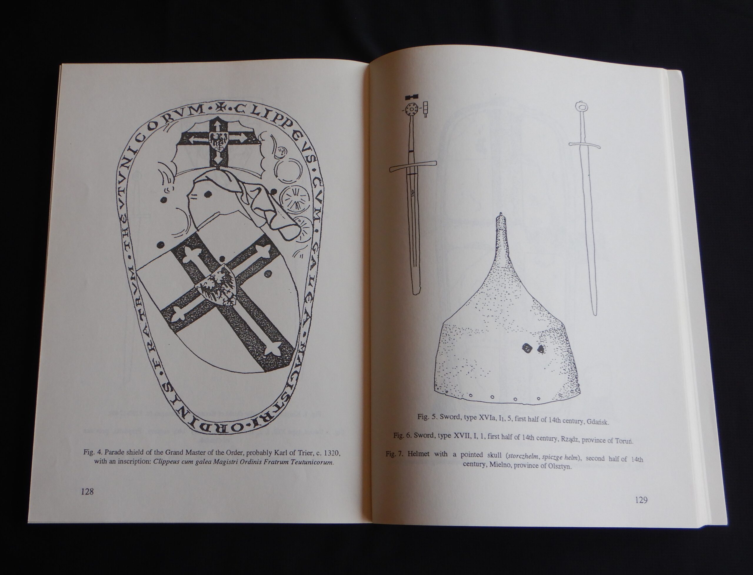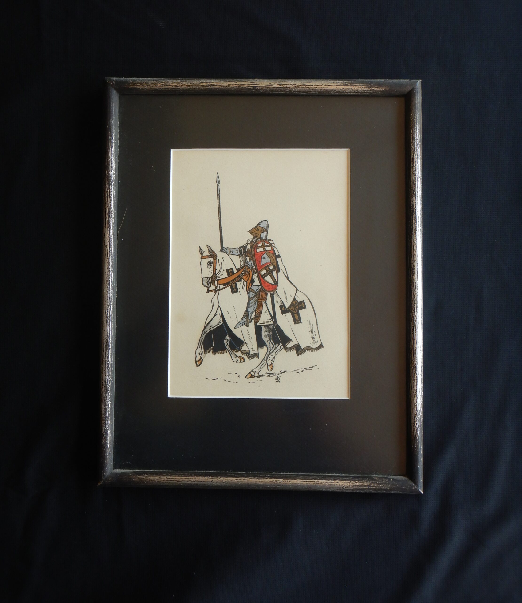 Od 5 lipca 2024 roku do 1 października 2024 roku, a być może do końca tego roku Muzeum Zamkowe Malborku prezentuje publiczności i prezentować będzie wystawę: „Krzyżak jak malowany”. Nie byłem jeszcze w tym roku w Malborku, więc jej nie widziałem. Jednego jestem pewien. Tego obiektu, który teraz przedstawię, nie ma na przedmiotowej ekspozycji. Gdyby się tam znalazł, byłby bez wątpienia jedną z jej ozdób. Zatem jako miłośnik zapoznany tematyki krzyżackiej pokazuję przedstawienie Krzyżaka na pewno mało znane. Czynię to w cyklu: „ANDRZEJ KLEIN MAŁO ZNANY”. Będzie to teraz odsłona 7. Gdybym bawił się w numerologię, siódemka miałaby podwójne znaczenie w moim przypadku. Tym, którzy po raz pierwszy w cyklu, spieszę z informacją: Andrzej Klein był mi przyjacielem w broni i barwie. Pamięć o nim i jego spuściźnie plastycznej, a przede wszystkim o CZŁOWIEKU nakłada na mnie obowiązek zapisywania -być może nieudolnie – oraz upowszechniania świadectw jego dorobku artystycznego, który -moim zdaniem- wskutek splotu rozlicznych zawirowań dziejowych (których nie szczędzi nam historia) nie zajął należnej mu pozycji. Odsłona 7 prezentuje coś – nawet jak dla mnie – niezwykłego. Jest to obraz przedstawiający wielkiego mistrza na koniu w galopie(?). Powstał on: 2024 – 1974 = 50 ca pół wieku temu. W 1974 roku mistrz Andrzej Klein posługiwał się inną kreską w swoich pracach. Była ona drobniejsza, cieńsza i gęstsza. Nie akcentowała mocno konturu. Miała w sobie coś z rysunku rekonstrukcyjnego. Uzupełniał ją umiejętnie stosowany – acz oszczędnie – kolor. Kolor, który tak cenią znawcy barwy, szczególnie ci od miłośników broni i barwy. Późniejszą technikę – tak dla własnego użytku – nazwałem flamastrową. Charakteryzowała się wyrazistymi liniami. Wzbogacała tylko stosowane przez niego środki wyrazu. Wzmacniała przekaz treści zawartej na karcie papieru. W tematyce bronioznawczej niosła komunikat nie pozostawiający żadnych niedomówień. Nie było i nie ma więc, w tym niczego pejoratywnego. Wypracowanie własnego stylu, rozpoznawalnego na pierwszy rzut oka to nieczęsty dar. Od pierwszego dźwięku instrumentu rozpoznaję gitarzystów obdarzonych tym przymiotem, mimo iż sam nie mogę poszczycić się dobrym słuchem muzycznym. Jeśli mnie pamięć nie myli, to nasze Państwo Podziemne w ramach akcji N skierowanej do Niemców celem obniżenia ich morale, zatrudniało wielu rysowników, którzy ostrzem ciętej graficznej satyry godzili we wroga. Nie wszystkich jednak chętnych do tej niezwykłej pracy konspiracyjnej, brano pod uwagę. A to ze względu na stosowany przez nich niepowtarzalny i rozpoznawalny styl rysunku. On to eliminował między innymi twórczość Jerzego Zaruby. Problemy miała też Maja Berezowska z racji subtelnej kreski, autorskiego znaku firmowego. Ale to inna historia. W kreacji Andrzeja Kleina, wielki mistrz zakonu krzyżackiego niesie na lewym ramieniu tarczę ceremonialną – jak myślę – Karola z Trewiru. Dlaczego ceremonialną? Spodziewałbym się bardziej, że wielki mistrz przedstawiony w uzbrojeniu XV – wiecznym i w kropierzu ze znakami wielkiego mistrza Zakonu Szpitala Najświętszej Marii Panny Domu Niemieckiego w Jerozolimie, powinien raczej nieść tarczę na której w czteropolowym podziale winny sąsiadować herb wielkiego mistrza zakonu i herb własny wielkiego mistrza w układzie szachownicowym. Uradowany darem, nie zapytałem autora, skąd wziął się pomysł takiego, a nie innego przedstawienia wielkiego mistrza w tej właśnie kreacji. Wiem z jego relacji, że wiele spraw z dziedziny broni i barwy konsultował z Andrzejem Nadolskim. Panowie znali się, należeli do Stowarzyszenia Miłośników Dawnej Broni i Barwy i niejednokrotnie współpracowali ze sobą. Rysunek tarczy wielkiego mistrza Karola z Trewiru w wykonaniu Andrzeja Kleina pojawił się również w publikacjach książkowych autorstwa Andrzeja Nowakowskiego ilustrowanych przez Andrzeja Kleina. Są to: „Uzbrojenie wojsk krzyżackich w Prusach w XIV w. i na początku XV w.” Łódź 1980 i jej angielskojęzyczna wersja: „Arms and armour in the medieval Teutonic Order’s State in Prussia” Łódź 1994. Wracając do obrazu wielkiego mistrza zakonu krzyżackiego autorstwa Andrzeja Kleina, nie sposób nie zauważyć jak wielki wpływ miała twórczość tego miłośnika broni i barwy na innych członków naszego Stowarzyszenia. Swego czasu pisałem na naszej Stronie o Piotrze Górkiewiczu i jego Oficynie Cynowej „PZ”. Zainteresowanych odsyłam do tekstu: https://www.bronibarwa.org.pl/10379-2/. Tych mniej zachłannych na tę wiedzę, informuję, że Piotr Górkiewicz tworzył projektowane przez siebie figury historyczne prezentujące mężów zbrojnych w szerokim spektrum czasowym. Były wśród przedstawienia husarzy, pancernych, żołnierzy z czasów napoleońskich i rycerstwa spod Grunwaldu, by wymienić tylko niektóre. Wyroby oficyny „PZ” są rozsiane po całym świecie i wszędzie jawią się jako ozdoby kolekcji. Z racji moich zainteresowań Krzyżakami i uzbrojeniem ochronnym szczególną uwagę skupiałem na figurkach historycznych kreujących zbrojnych z tego okresu. Wielki mistrz uwieczniony na obrazie -bohaterze- niniejszego pisania mógł być nieobcy Piotrowi Górkiewiczowi, który znał dobrze Andrzeja Kleina. Kreacja Krzyżaka z 1974 roku musiała zapaść w pamięć założyciela Oficyny Cynowej „PZ”. Inauguracja jej działalności nastąpiła kilka lat później. Świadectwem tego jest prezentowana figura konna wielkiego mistrza w dynamicznym ujęciu. Skojarzenie z obrazem miał też Leszek Rościszewski (tym nabytkiem na pewno mu się pochwaliłem), który cynową kreację Krzyżaka autorstwa Piotra Górkiewicza, pomalował w swoim stylu, w mistrzowski sposób.