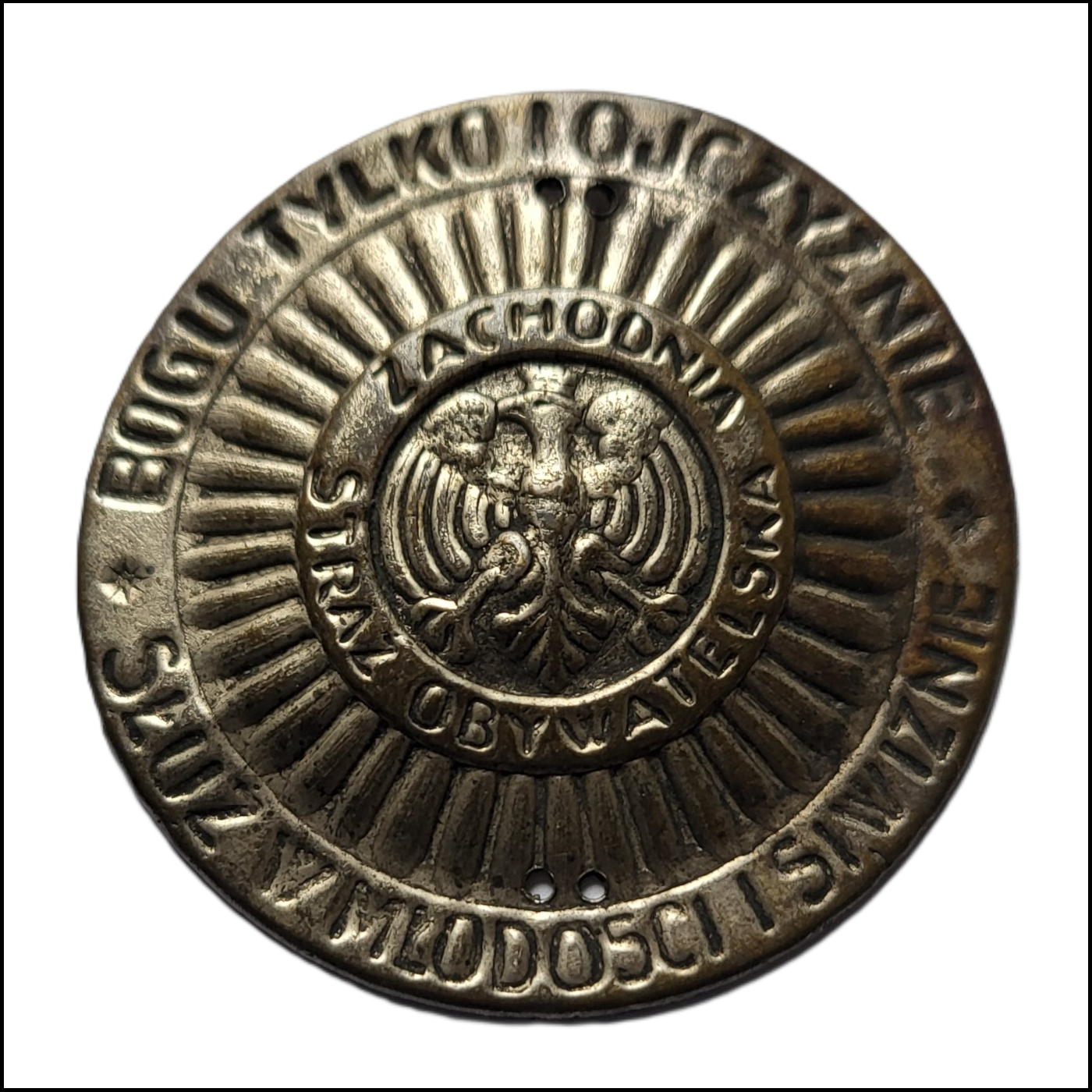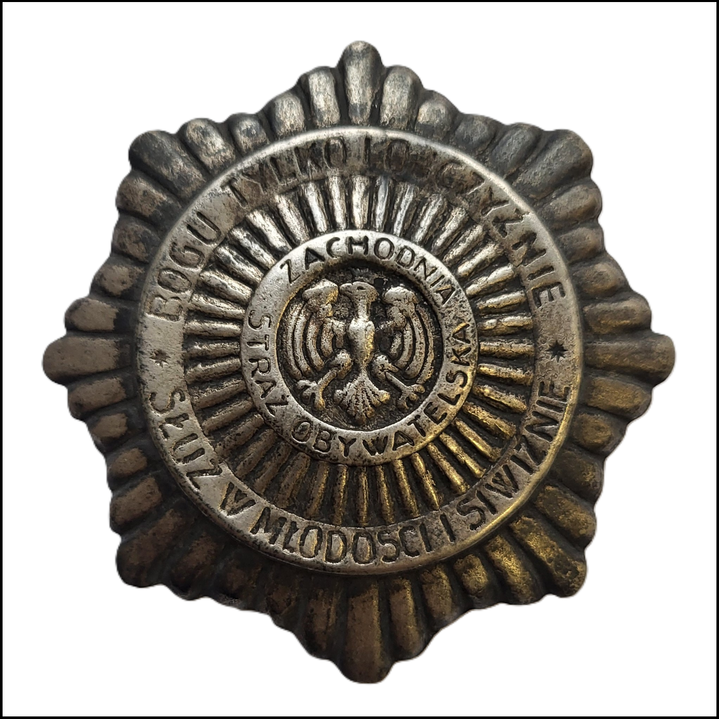 Pierwszym, najbardziej charakterystycznym znakiem, jest oznaka rozpoznawcza w kształcie kokardy, z orłem z otwartą koroną na głowie i napisem „ZACHODNIA” „STRAŻ OBYWATELSKA” pośrodku. Na obrzeżu umieszczona została dewiza (hasło) formacji „BOGU TYLKO I OJCZYŹNIE” „SŁUŻ W MŁODOŚCI I SIWIŹNIE”. Przy górnej i dolnej krawędzi znajdują się podwójne otworki do przeszycia nićmi mocującymi oznakę na nakryciu głowy lub na innej części ubioru.