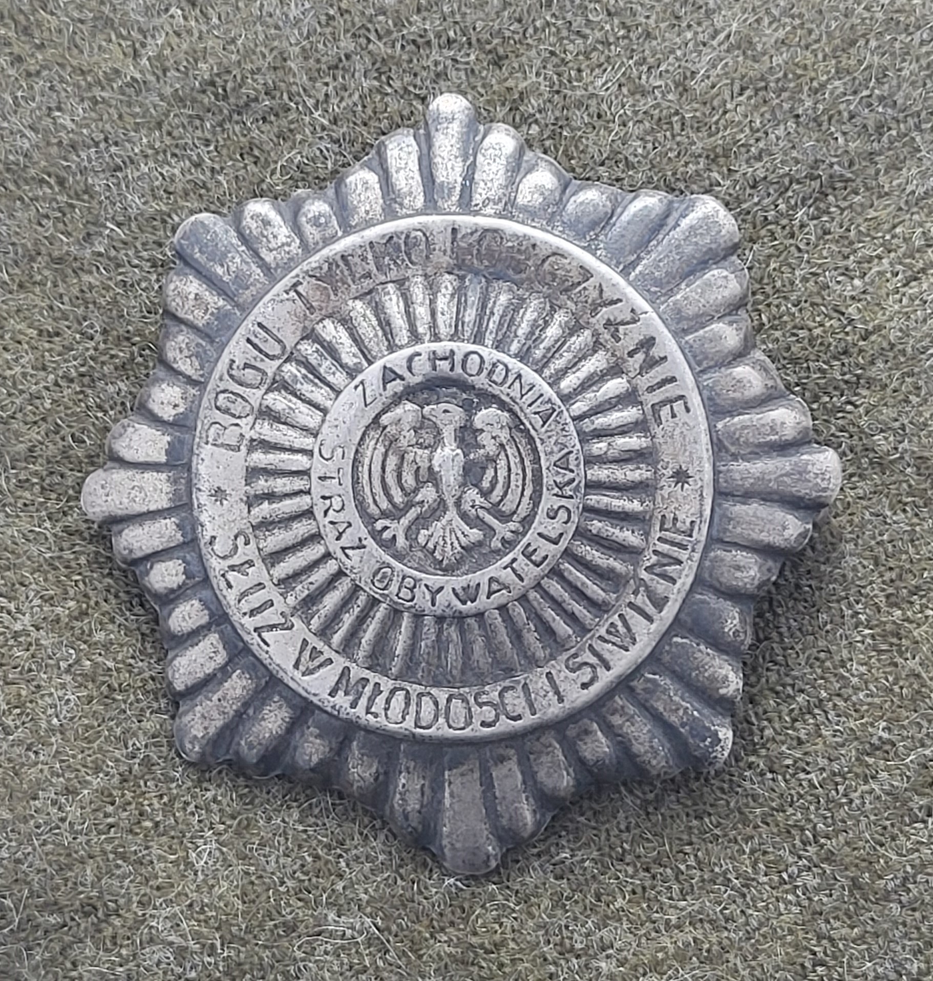 Czwartym znakiem, o największych rozmiarach, jest oznaka w kształcie gwiazdy ośmiopromiennej z wizerunkiem oznaki rozpoznawczej formacji. Przypinana była do ubioru dużą ruchomą szpilą przylutowaną poziomo na odwrocie. Była to prawdopodobnie oznaka wyróżniająca komendantów Zachodniej Straży Obywatelskiej.